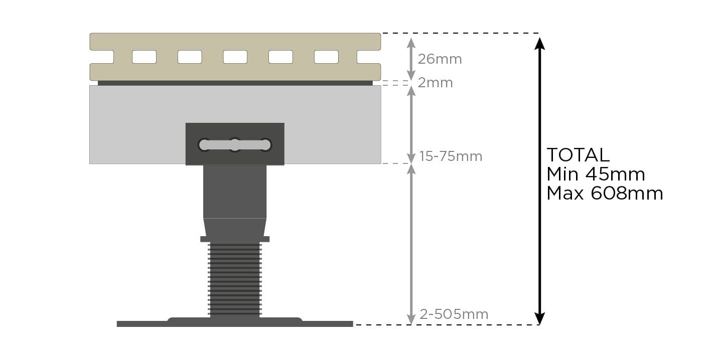 System overall height range45mm to 608mm as standard, custom heights available (incl. decking)